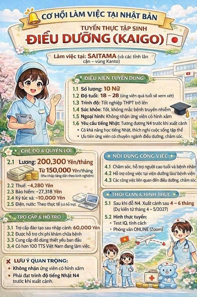 – Ưu tiên ứng viên học điều dưỡng, chăm sóc hoặc có định hướng theo ngành Kaigo