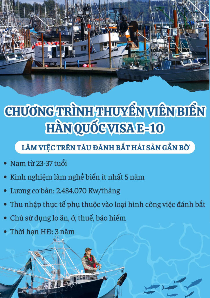 2. Yêu cầu công việc: Làm việc trên các tầu đánh bắt hải sản gần bờ (tàu trên 20 tấn) tại Hàn Quốc theo chương trình thuyền viên gần bờ của Bộ thuỷ sản và hiệp hội thuỷ sản trung ương Hàn Quốc.