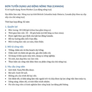 👉 Thu nhập: 18 CAD/giờ, 30–40 giờ/tuần, có tăng ca theo mùa