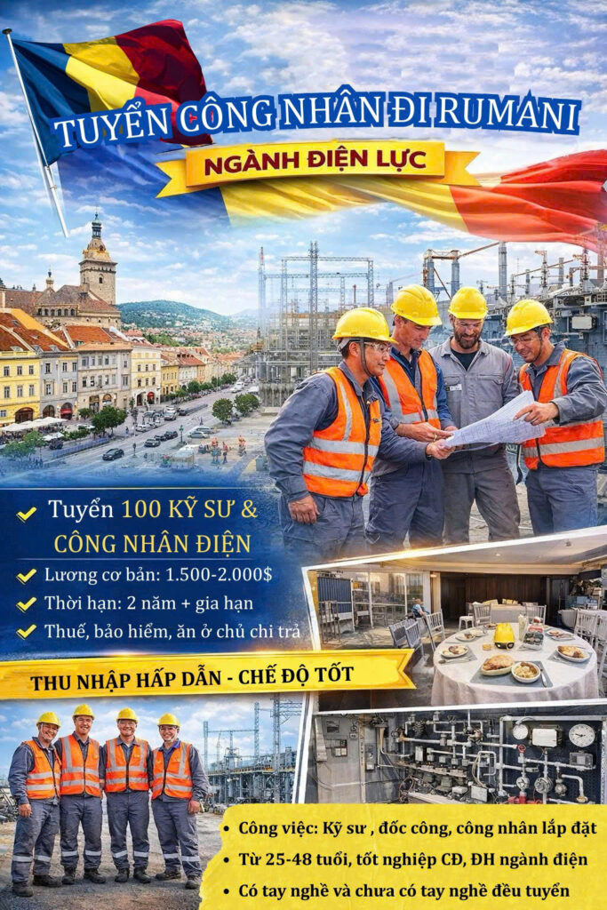 TUYỂN 100 KỸ SƯ & CÔNG NHÂN ĐIỆN – LÀM VIỆC TẠI RUMANI (CHÂU ÂU) 🇷🇴